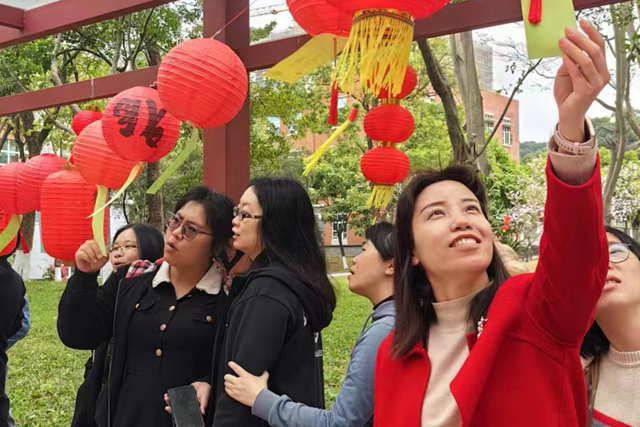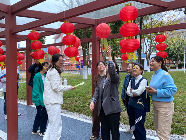 活動現(xiàn)場,各式燈籠裝飾點綴著整個花園長廊,滿是熱鬧喜慶的歡樂氛圍。燈籠下的謎底既貼近生活,又潛藏著民俗文化和歷史地理的知識,讓猜謎的過程趣味盎然、寓教于樂,參與的職工及學(xué)生或獨立思考,或發(fā)揚(yáng)團(tuán)隊合作精神,在展現(xiàn)各自才華的同時,領(lǐng)略了傳統(tǒng)文化的魅力和韻味。