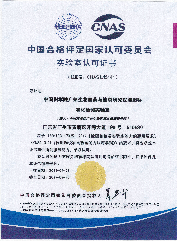 (細胞標準化檢測實驗室獲CNAS認可證書)