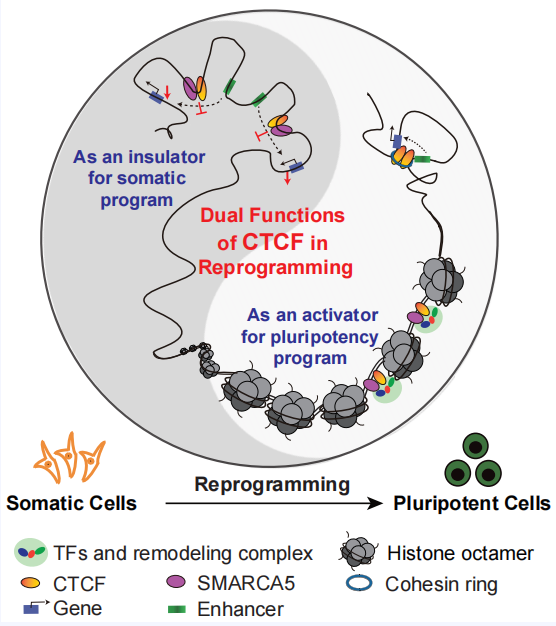 運用體細胞重編程到誘導(dǎo)多能干細胞為模型結(jié)合多維組學(xué)技術(shù)并聯(lián)合生物信息分析,揭示了CTCF介導(dǎo)的染色質(zhì)絕緣和染色質(zhì)結(jié)構(gòu)變化協(xié)同調(diào)控干細胞多能性獲得的新機制(2022,Cell Reports)