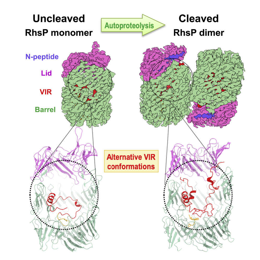 利用單顆粒冷凍電鏡技術(shù)首次揭示細(xì)菌分泌的毒素效應(yīng)蛋白RhsP自水解前后的構(gòu)象變化,并闡明二聚體的形成對于靶向獵物細(xì)胞有重要作用。(2022,Cell Reports)。