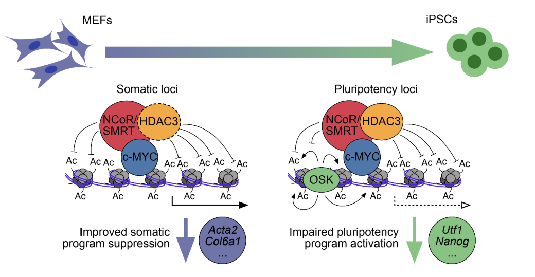 轉(zhuǎn)錄輔助抑制因子NCoR/SMRT復(fù)合物通過介導(dǎo)組蛋白去乙酰化形成體細(xì)胞重編程的關(guān)鍵障礙(2018,Nature Cell Biology)。