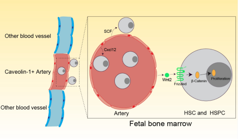 在實驗動物研究中發(fā)現(xiàn),造血干細胞發(fā)育過程中,動脈血管調(diào)控造血干細胞首次進入胚胎期骨髓。