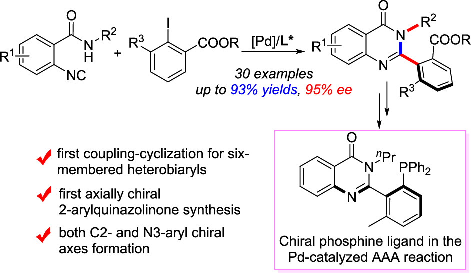 實現(xiàn)了鈀催化的官能化異腈的不對稱亞胺基環(huán)化反應,拓展了合成軸手性聯(lián)芳基化合物的新策略。