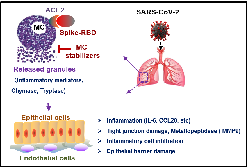 SARS-CoV-2 Spike蛋白通過結合肥大細胞ACE2受體快速誘導肥大細胞脫顆粒,繼而誘發(fā)肺上皮細胞炎癥和導致肺損傷;臨床治療變應性疾病的藥物如依巴斯汀和氯雷他定可作為肥大細胞穩(wěn)定劑通過阻止Spike蛋白誘導的肥大細胞脫顆粒,進而抑制SARS-CoV-2誘導的小鼠肺部炎癥和保護肺損傷。