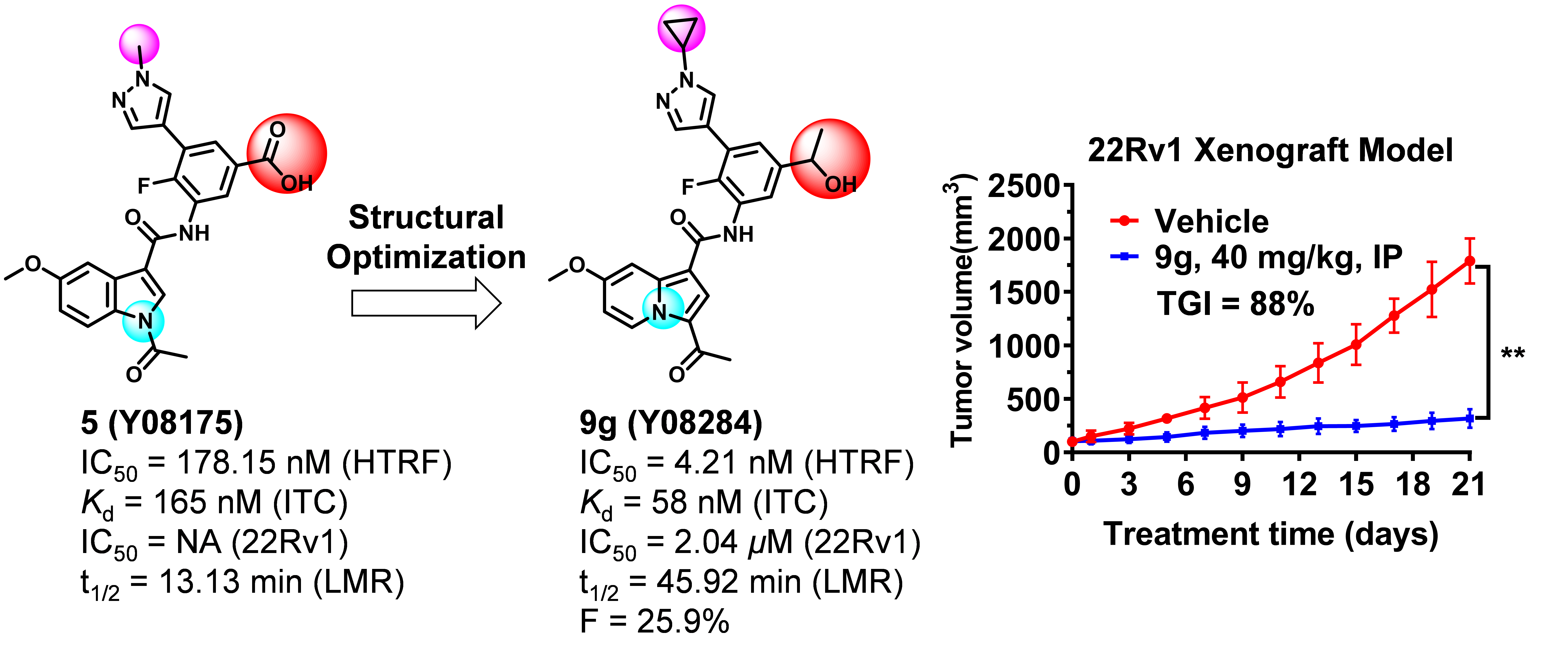 許永課題組長期致力于CBP小分子抑制劑的研究,并取得了系統(tǒng)性成果(Eur J Med Chem 2018;Acta Pharmacol Sin 2019)。本研究結(jié)合計算機(jī)輔助藥物設(shè)計和藥物化學(xué)改造對前期獲得的化合物Y08175進(jìn)行結(jié)構(gòu)優(yōu)化,最終得到了成藥性良好的化合物Y08284。Y08284可顯著抑制CBP蛋白活性(IC50 = 4.21 nM),同時表現(xiàn)出良好的藥代動力學(xué)性質(zhì)(F = 25.9%)。Y08284可有效抑制多種前列腺癌細(xì)胞系的增殖,同時可以抑制AR及AR下游基因的表達(dá)。在22Rv1前列腺癌小鼠移植瘤實(shí)驗(yàn)中,Y08284可有效抑制腫瘤的生長(PO, TGI=78%; IP, TGI=88%)。本研究為前列腺癌及其臨床耐藥提供了一種新的候選化合物。