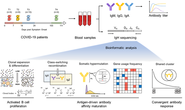 基于抗體組學(xué)技術(shù)、從抗體庫轉(zhuǎn)錄水平分析新冠感染引起的B細胞反應(yīng)在克隆增殖與分化、抗體類別轉(zhuǎn)換、體細胞高頻突變、抗體基因使用頻率及共享抗體克隆型等方面的動態(tài)變化與關(guān)鍵特征。
