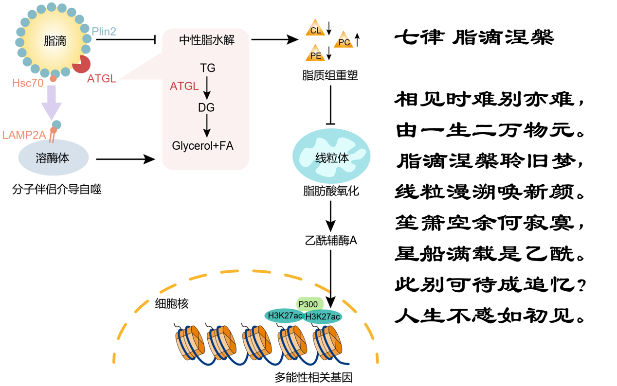 “輕輕的我走了,正如我輕輕的來”,多能性與脂滴一路陪伴,而多能性退出時(shí),脂滴也“涅槃”消失,起始分化為各胚層的發(fā)育進(jìn)程,正是“相見時(shí)難別亦難,由一生二萬物元”。脂滴的消失,通過細(xì)胞器互作重塑線粒體磷脂組分與內(nèi)嵴重塑,正是“脂滴涅槃聆舊夢(mèng),線粒漫溯喚新顏”。 進(jìn)一步乙酰輔酶A通過組蛋白乙?;铀俣嗄苄缘耐顺?,正是“笙簫空余何寂寞,星船滿載是乙?!?。這一發(fā)現(xiàn)對(duì)于胚胎早期發(fā)育具有重要的生理意義,然而,當(dāng)人生到達(dá)“四十而不惑”的油膩中年,脂滴在肝臟、腫瘤、退化神經(jīng)等又重現(xiàn),這一發(fā)現(xiàn)同樣具有重要的病理意義,正是“此別可待成追憶?人生不惑如初見?!?nbsp;