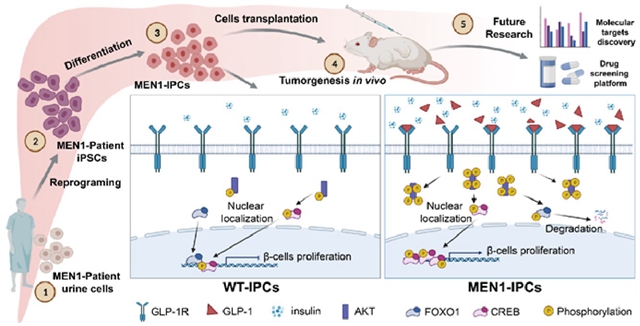 課題組通過(guò)收集一個(gè)MEN1家庭中母子兩位患者的尿液,建立了重編程細(xì)胞株(iPSCs),在MEN1-iPSC分化的胰島β樣細(xì)胞階段,重現(xiàn)高胰島素分泌的臨床表型。該表型的基礎(chǔ)是MEN1細(xì)胞從胰祖細(xì)胞階段開(kāi)始,表現(xiàn)出強(qiáng)大的增殖能力,產(chǎn)生大量的胰島β樣細(xì)胞,導(dǎo)致高胰島素分泌。探究其病理機(jī)制,發(fā)現(xiàn)受MEN1負(fù)調(diào)控的胰高血糖素樣肽-1(GLP-1)的分泌上調(diào),通過(guò)結(jié)合GLP-1R,激活PI3K/AKT信號(hào)傳導(dǎo),改變了調(diào)控β細(xì)胞增殖兩個(gè)關(guān)鍵轉(zhuǎn)錄因子FOXO1和CREB的磷酸化,導(dǎo)致FOXO1和CREB的失衡,引起 MEN1來(lái)源胰島素陽(yáng)性細(xì)胞的高增殖和高胰島素分泌。GLP-1R或PI3K的抑制劑可以逆轉(zhuǎn)這種表型,闡明GLP-1R是導(dǎo)致MEN1胰腺內(nèi)分泌瘤的高胰島素血癥的病理關(guān)鍵和潛在的治療靶點(diǎn)。