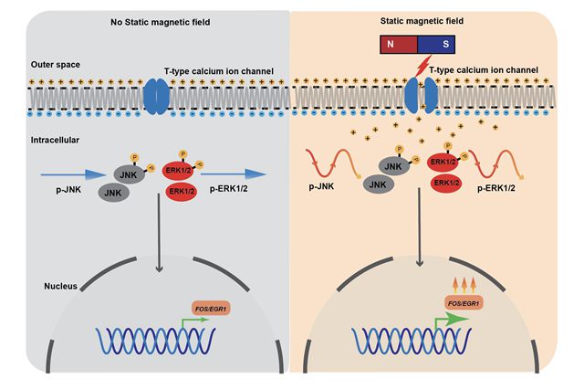 劉晶課題組通過在140mT的靜磁場環(huán)境培養(yǎng)hUCMSCs,發(fā)現(xiàn)了細(xì)胞的增殖速率隨磁場強度和磁暴時間的增加而提升的表型。課題組深入探究其信號傳導(dǎo)機制,發(fā)現(xiàn)靜磁場通過調(diào)控MAPK信號通路介導(dǎo)細(xì)胞增殖,且MAPK信號通路中ERK和JNK的磷酸化表達(dá)隨磁場時間變化呈現(xiàn)周期性震蕩。通過電致變色染料檢測實驗發(fā)現(xiàn),30分鐘140mT的靜磁場刺激導(dǎo)致hUCMSCs去極化(即膜電勢差降低),證明去極化在增殖過程中起到關(guān)鍵作用。課題組進(jìn)一步通過抑制T型鈣離子通道,發(fā)現(xiàn)磁場失去了調(diào)控hUCMSCs增殖的能力,證實T型鈣離子通道是hUCMSCs響應(yīng)靜磁場信號的重要感應(yīng)器。本研究為揭示靜磁場的臨床應(yīng)用提供了重要的細(xì)胞生物學(xué)基礎(chǔ)。