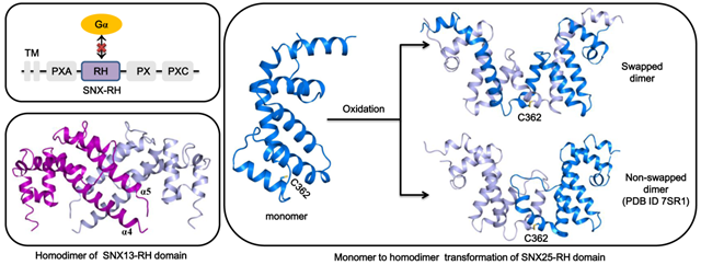 作為內(nèi)吞途徑的第一個轉(zhuǎn)運分選站,內(nèi)涵體被認為是信號轉(zhuǎn)導(dǎo)的重要平臺。越來越多的研究發(fā)現(xiàn),很多被內(nèi)吞的G蛋白偶聯(lián)受體(GPCR),在內(nèi)涵體上依然具有信號轉(zhuǎn)導(dǎo)活性。由于含有RGS 同源結(jié)構(gòu)域(RH),SNX-RH亞家族蛋白(SNX13、SNX14和SNX25)被認為可能具有分選轉(zhuǎn)運和調(diào)控GPCR-G蛋白信號轉(zhuǎn)導(dǎo)的雙重功能。然而,科學(xué)家們對SNX-RH蛋白的RH結(jié)構(gòu)域是否具有G蛋白信號轉(zhuǎn)導(dǎo)調(diào)節(jié)活性仍然存在爭議。