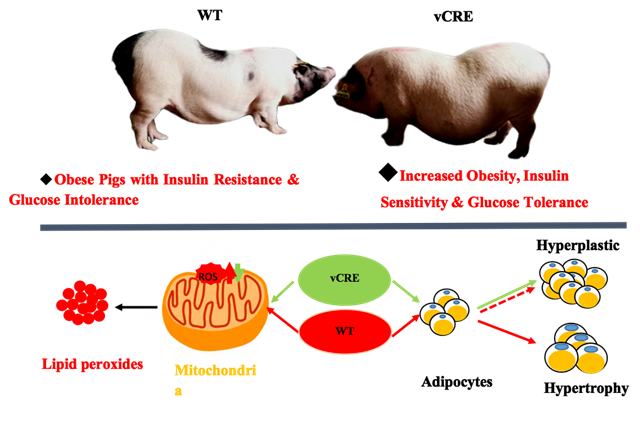 CREBRFR457Q點(diǎn)突變豬表現(xiàn)出肥胖表型,其體重、腹圍以及總體脂肪含量均高于野生型豬,并且脂肪積累主要在皮下,內(nèi)臟脂肪積累不顯著。與野生型的脂肪組織相比,點(diǎn)突變豬脂肪細(xì)胞數(shù)量多,體積小。體外脂肪分化實(shí)驗(yàn)也表明CREBRFR457Q變體促進(jìn)前脂肪細(xì)胞分化。CREBRFR457Q導(dǎo)致的肥胖是由脂肪細(xì)胞數(shù)量增加(增生)而不是體積增大(過度增大)引起的,CREBRFR457Q點(diǎn)突變導(dǎo)致的肥胖在某種程度上是保護(hù)肥胖。血液生化分析表明該點(diǎn)突變在維持正常的胰島素敏感性的基礎(chǔ)上,上調(diào)了血液中的胰島素水平。課題組進(jìn)一步通過氧化水平的監(jiān)測,發(fā)現(xiàn)該點(diǎn)突變能降低脂肪組織中氧化代謝能力、增強(qiáng)抗氧化能力,減少ROS的產(chǎn)生,從而降低氧化應(yīng)激水平,以及由此帶來的胰島素抵抗等反應(yīng)。本研究初步揭示了該點(diǎn)突變通過促進(jìn)脂肪細(xì)胞生成導(dǎo)肥胖癥,而通過降低氧化代謝、維持正常的胰島素敏感性降低2型糖尿病風(fēng)險的機(jī)制,為預(yù)防肥胖人群罹患糖尿病提供了新的思路。