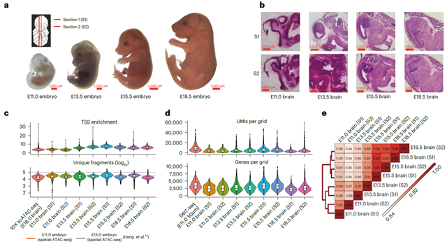 圖2. E11.0, E13.5, E15.5 和E18.5小鼠腦的空間基因表達(dá)、染色質(zhì)可及性以及結(jié)合二者的空間圖譜
