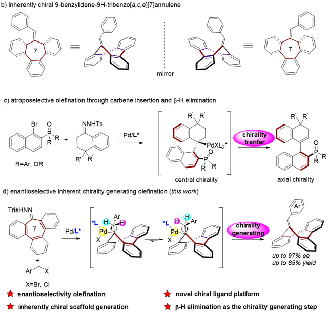 在過去的幾十年里,人們對中心手性、軸向手性、平面手性和螺旋手性的研究非常深入,取得了許多優(yōu)異的成果。但是,人們對固有手性分子的手性特征,不對稱合成研究,以及它們在生物活性及光學(xué)材料等方面的應(yīng)用卻遠(yuǎn)遠(yuǎn)落后。這是因?yàn)楣逃惺中?/span>中環(huán)分子的非平面但穩(wěn)定的構(gòu)象通常被忽略,它們被常常視為非手性的平面分子;或者即使認(rèn)為它們具有非平面的構(gòu)象,也認(rèn)為這些構(gòu)象是動(dòng)態(tài)的,不穩(wěn)定的。朱強(qiáng)/羅爽團(tuán)隊(duì)在成功實(shí)現(xiàn)兩類氮雜八元環(huán)固有手性化合物的不對稱合成以后,再次實(shí)現(xiàn)了對更具挑戰(zhàn)性的全碳七元環(huán),即固有手性三苯并輪烯衍生物的不對稱合成。在這項(xiàng)研究中,研究人員通過鈀催化的七元環(huán)腙衍生物為卡賓前體與芐基溴進(jìn)行反應(yīng),在溫和的條件下,高產(chǎn)率、優(yōu)異對映選擇性地合成了多種固有手性的三苯并輪烯衍生物。密度泛函理論計(jì)算揭示了在這一過程中決定立體化學(xué)的步驟是通過卡賓遷移插入和 -氫消除形成外環(huán)雙鍵,通過不對稱的 -氫消除來控制產(chǎn)物的手性。這種只通過 -氫消除而產(chǎn)生手性的例子非常罕見(圖2)。同時(shí),研究人員發(fā)現(xiàn)從其中一個(gè)固有手性產(chǎn)物衍生出的手性膦配體1在不對稱的Tsuji-Trost反應(yīng)和1,4-加成反應(yīng)中表現(xiàn)出卓越的催化性能,表明固有手性的三苯并輪烯衍生物是設(shè)計(jì)新手性配體和催化劑的優(yōu)秀骨架(圖3)。再次證明了長期被忽視的固有手性可以在不對稱合成乃至更多的領(lǐng)域大有可為。