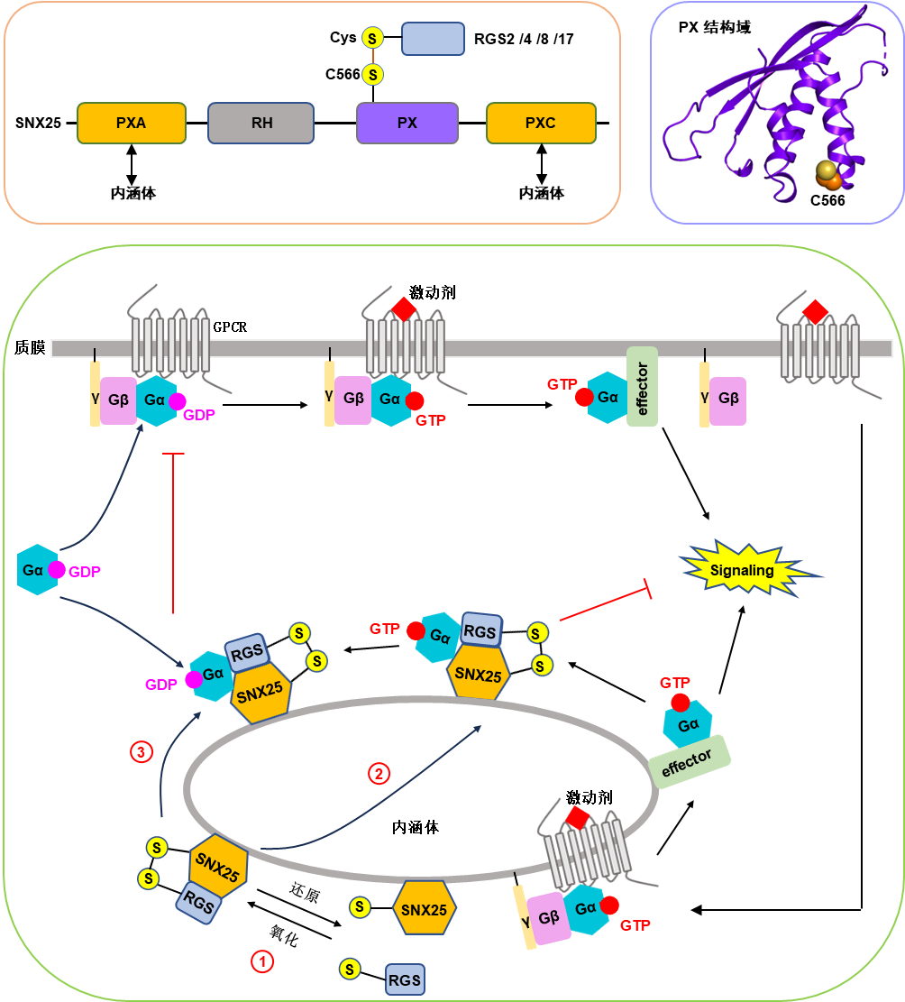 研究團隊利用免疫沉淀-質譜聯(lián)用技術和熒光共定位等實驗方法,發(fā)現(xiàn)SNX25的PX結構域能結合一些經典的RGS蛋白,包括RGS2、RGS4、RGS8和RGS17。通過結構生物學和細胞生物學實驗,研究團隊發(fā)現(xiàn)SNX25與RGS蛋白的相互作用主要依賴SNX25-PX結構域中C566與RGS蛋白N端半胱氨酸形成的分子間二硫鍵,且該相互作用受氧化還原的調控。通過熒光共定位實驗,團隊進一步發(fā)現(xiàn)PXA和PXC結構域可以介導SNX25靶向內涵體。通過招募經典RGS蛋白到內涵體,SNX25可以促進內涵體上Gαi/q蛋白的失活,最終抑制內涵體上GPCR-Gi/q偶聯(lián)的信號轉導(圖1)。