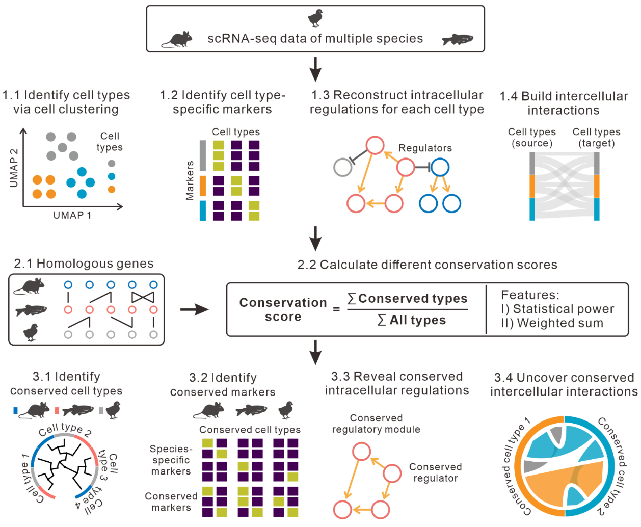 物種不僅在基因層面,也在細胞類型、基因表達、基因調控、細胞間相互作用等方面顯示出進化保守性。單細胞轉錄組測序技術已廣泛用于不同物種的單細胞表達研究,為在細胞類型水平研究物種的進化保守性提供了新機會。已有的算法能通過分析跨物種單細胞轉錄組數(shù)據識別進化保守的細胞類型,如Seurat和SAMap等。但是,這些方法主要通過跨物種的單細胞聚類確定保守細胞類型,其準確性在很大程度上取決于跨物種批次效應校正的能力。這些軟件對進化距離較遠物種進行聚類分析,仍存在明顯不足。此外,目前仍沒有方法能確定細胞間相互作用的進化保守性。