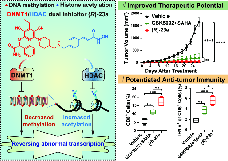 在該研究中,團(tuán)隊(duì)通過(guò)融合DNMT1和HDAC抑制劑的關(guān)鍵藥效基團(tuán),獲得了一系列DNMT1/HDAC雙效抑制劑。其中,化合物(R)-23a在體外和細(xì)胞中對(duì)DNMT1和Class-I HDAC表現(xiàn)出有效的“在靶”抑制活性,從而逆轉(zhuǎn)腫瘤特異性DNA高甲基化和組蛋白低乙?;?。與DNMT1或HDAC單靶點(diǎn)抑制劑相比,化合物(R)-23a引起更為顯著的轉(zhuǎn)錄組變化,包括激活多個(gè)表觀遺傳沉默的抑癌基因和下調(diào)關(guān)鍵致癌基因。在抗腫瘤活性和安全性方面,DNMT1/HDAC雙效抑制劑(R)-23a可通過(guò)直接殺傷腫瘤細(xì)胞,或重編程腫瘤免疫微環(huán)境,進(jìn)而誘導(dǎo)實(shí)體腫瘤的消退,其抗腫瘤活性和安全性?xún)?yōu)于單一靶點(diǎn)藥物聯(lián)用。