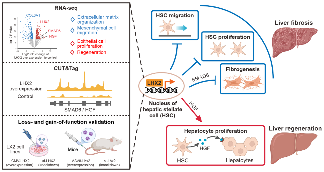 圖2?LHX2在肝纖維化和再生中調(diào)控作用的示意圖。通過轉(zhuǎn)錄組(RNA-seq)、蛋白結(jié)合的DNA位點(diǎn)檢測技術(shù)(CUT&Tag)以及敲降和過表達(dá)功能實(shí)驗(yàn),揭示了LHX2能夠抑制肝星狀細(xì)胞遷移、增殖和纖維生成,同時(shí)通過調(diào)控HGF的分泌促進(jìn)肝細(xì)胞增殖。