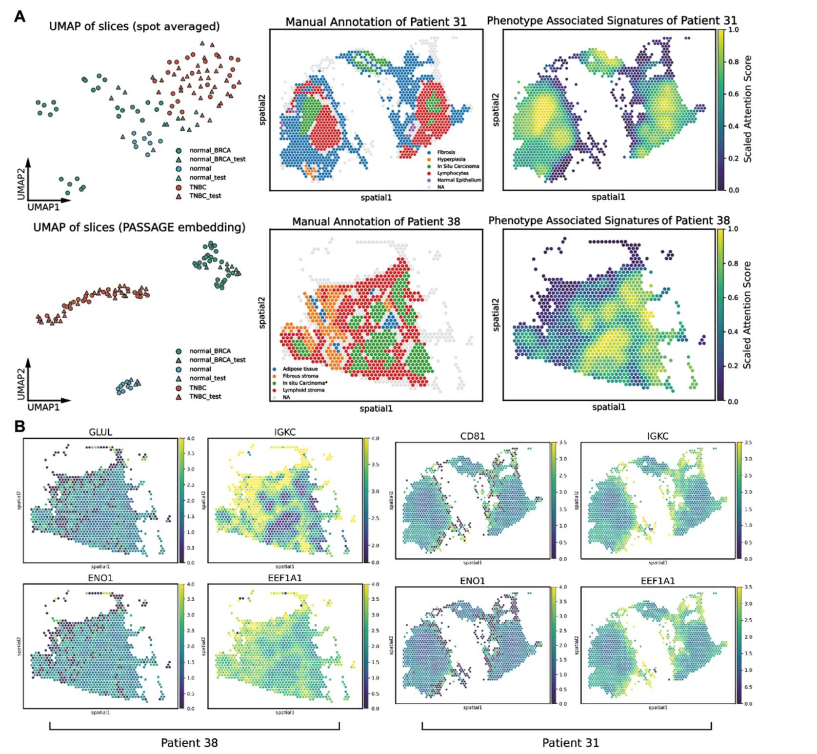 圖2 ?A) PASSAGE在乳腺癌案例中成功學習到良好的切片級表征與所識別的表型關(guān)聯(lián)空間特征?B) PASSAGE在乳腺癌案例中成功學習到與表型關(guān)聯(lián)空間特征高度關(guān)聯(lián)的基因集