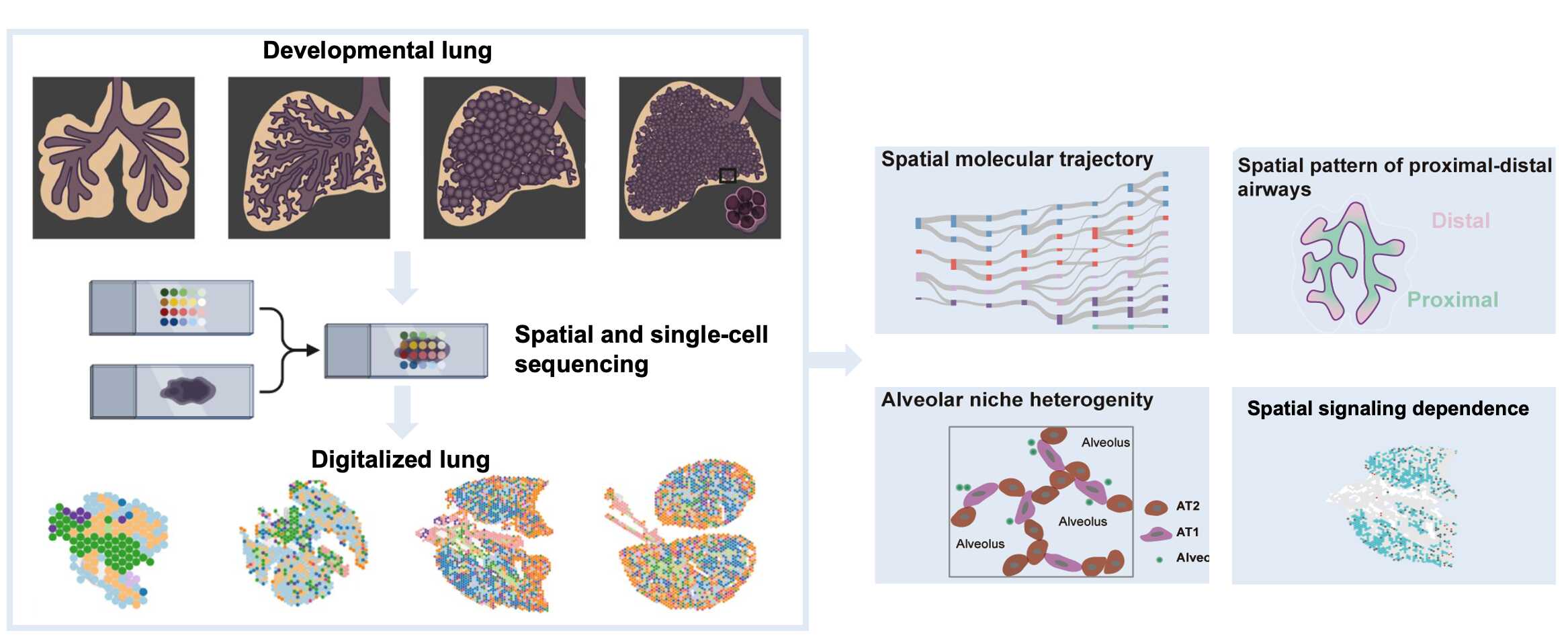 分子軌跡、近端和遠(yuǎn)端氣道發(fā)育的空間模式、肺泡發(fā)育的生態(tài)位異質(zhì)性和肺發(fā)育中的信號(hào)通路調(diào)控。