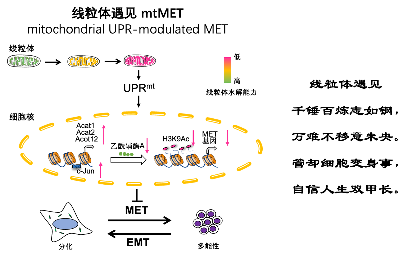 4月9日,中國科學(xué)院廣州生物醫(yī)藥與健康研究院劉興國團(tuán)隊(duì)與廣州醫(yī)科大學(xué)應(yīng)仲富團(tuán)隊(duì)在Nature Metabolism期刊上發(fā)表了一篇題為The mitochondrial unfolded protein response inhibits pluripotency acquisition and mesenchymal-to-epithelial transition in somatic cell reprogramming的文章。揭示了線粒體未折疊蛋白反應(yīng)(Mitochondrial unfolded protein response, UPRmt)在多能干細(xì)胞命運(yùn)中通過c-Jun調(diào)控組蛋白乙?;?,進(jìn)而影響間充質(zhì)-上皮轉(zhuǎn)化(MET)的新模式(mitochondrial UPR-modulated MET,mtMET)。這一模式的英文縮寫MET是“遇見”的過去式,因此將這一新模式稱為“線粒體遇見”。該研究進(jìn)一步擴(kuò)展了線粒體反向調(diào)控細(xì)胞核并調(diào)控細(xì)胞命運(yùn)的研究領(lǐng)域。此外,團(tuán)隊(duì)證明 UPRmt通過增強(qiáng)上皮-間充質(zhì)轉(zhuǎn)化 (EMT)促進(jìn)腫瘤遷移和侵襲,揭示了腫瘤治療的潛在新靶點(diǎn)。