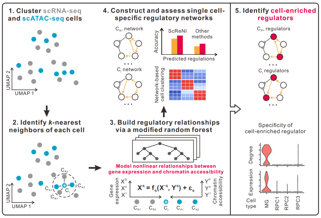 近日,中國(guó)科學(xué)院廣州生物醫(yī)藥與健康研究院王杰課題組與廣州國(guó)家實(shí)驗(yàn)室李亦學(xué)課題組合作,成功開(kāi)發(fā)了一種在單細(xì)胞水平構(gòu)建調(diào)控網(wǎng)絡(luò)的新工具ScReNI(Single-cell Regulatory Network Inference)。該工具通過(guò)整合單細(xì)胞轉(zhuǎn)錄組(scRNA-seq)與單細(xì)胞染色質(zhì)可及性(scATAC-seq)數(shù)據(jù),實(shí)現(xiàn)單細(xì)胞精度的基因調(diào)控網(wǎng)絡(luò)推斷。相關(guān)研究成果以題為“ScReNI: Single-cell Regulatory Network Inference Through Integrating scRNA-seq and scATAC-seq Data”的論文形式發(fā)表于國(guó)際學(xué)術(shù)期刊《Genomics, Proteomics & Bioinformatics》。