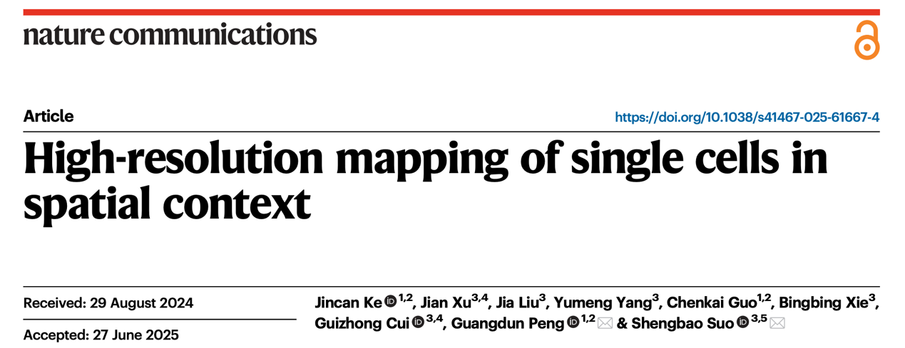 2025年7月15日,中國(guó)科學(xué)院廣州生物醫(yī)藥與健康研究院彭廣敦課題組和廣州國(guó)家實(shí)驗(yàn)室索生寶課題組合作,在Nature Communications上發(fā)表了題為High-resolution mapping of single cells in spatial context的研究論文。