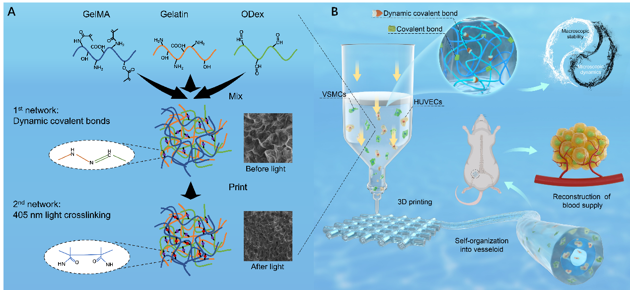 血管化是目前限制大尺寸組織工程支架構(gòu)建的關(guān)鍵問題。盡管近年來人工血管/血管網(wǎng)絡(luò)的生物制造技術(shù)獲得了巨大的發(fā)展,但構(gòu)建具備仿生結(jié)構(gòu)以及收縮功能的血管網(wǎng)絡(luò)一直是領(lǐng)域重大挑戰(zhàn)。為解決上述問題,研究團(tuán)隊開發(fā)了一種具有動態(tài)共價交聯(lián)網(wǎng)絡(luò)的仿ECM生物墨水,通過模擬ECM的適應(yīng)性微環(huán)境和結(jié)構(gòu)組分,引導(dǎo)血管內(nèi)皮細(xì)胞和血管平滑肌細(xì)胞自發(fā)排列形成具有仿生雙層結(jié)構(gòu)的血管網(wǎng)絡(luò)。