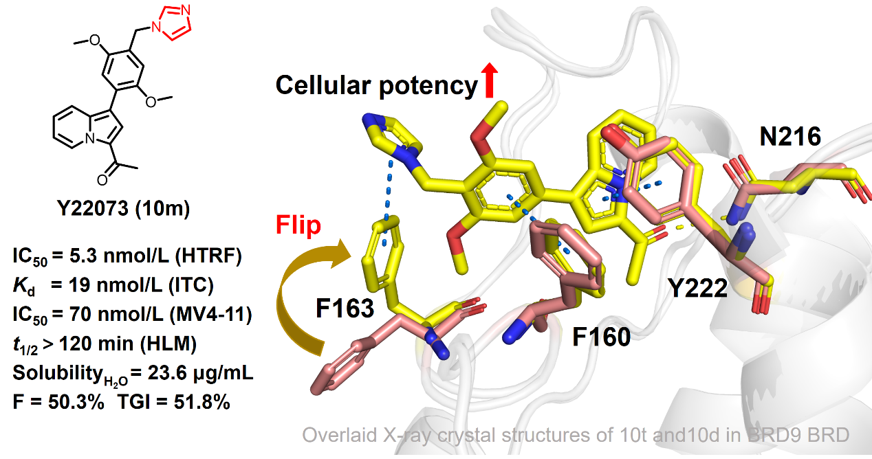 近日,中國科學(xué)院廣州生物醫(yī)藥與健康研究院許永團隊針對溴結(jié)構(gòu)域家族蛋白抑制劑選擇性難題,報道了一種在急性髓系白血病(AML)治療中具有顯著療效的BRD9選擇性抑制劑Y22073(專利申請?zhí)枺?025100176011.1),為AML 精準治療提供了全新解決方案。相關(guān)成果以“Key imidazolyl groups that induce phenylalanine flipping enhance the efficacy of oral BRD9 inhibitors for AML treatment”為題發(fā)表于藥物化學(xué)領(lǐng)域Top期刊Acta Pharmaceutica Sinica B上。