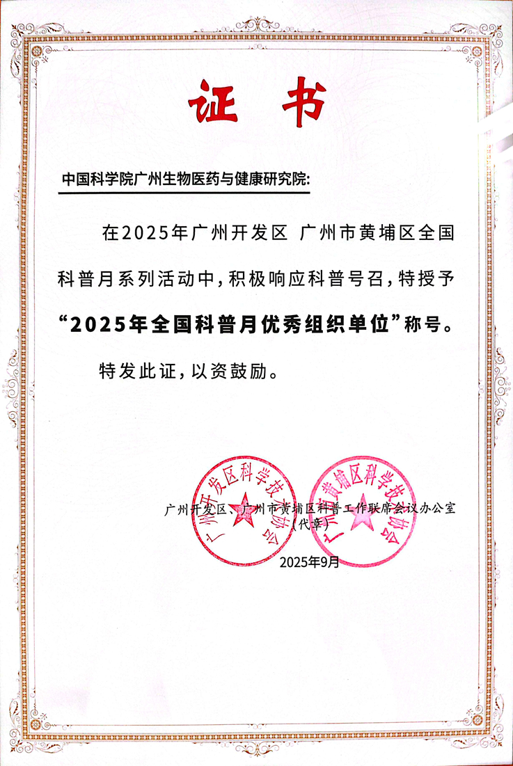 近日,中國科學(xué)院廣州生物醫(yī)藥與健康研究院(以下簡稱 “廣州健康院”)憑借在全國首個(gè)科普月期間的出色組織能力、豐富活動(dòng)形式及顯著社會(huì)成效,獲得黃埔區(qū)授予的“2025年全國科普月優(yōu)秀組織單位”稱號(hào)。