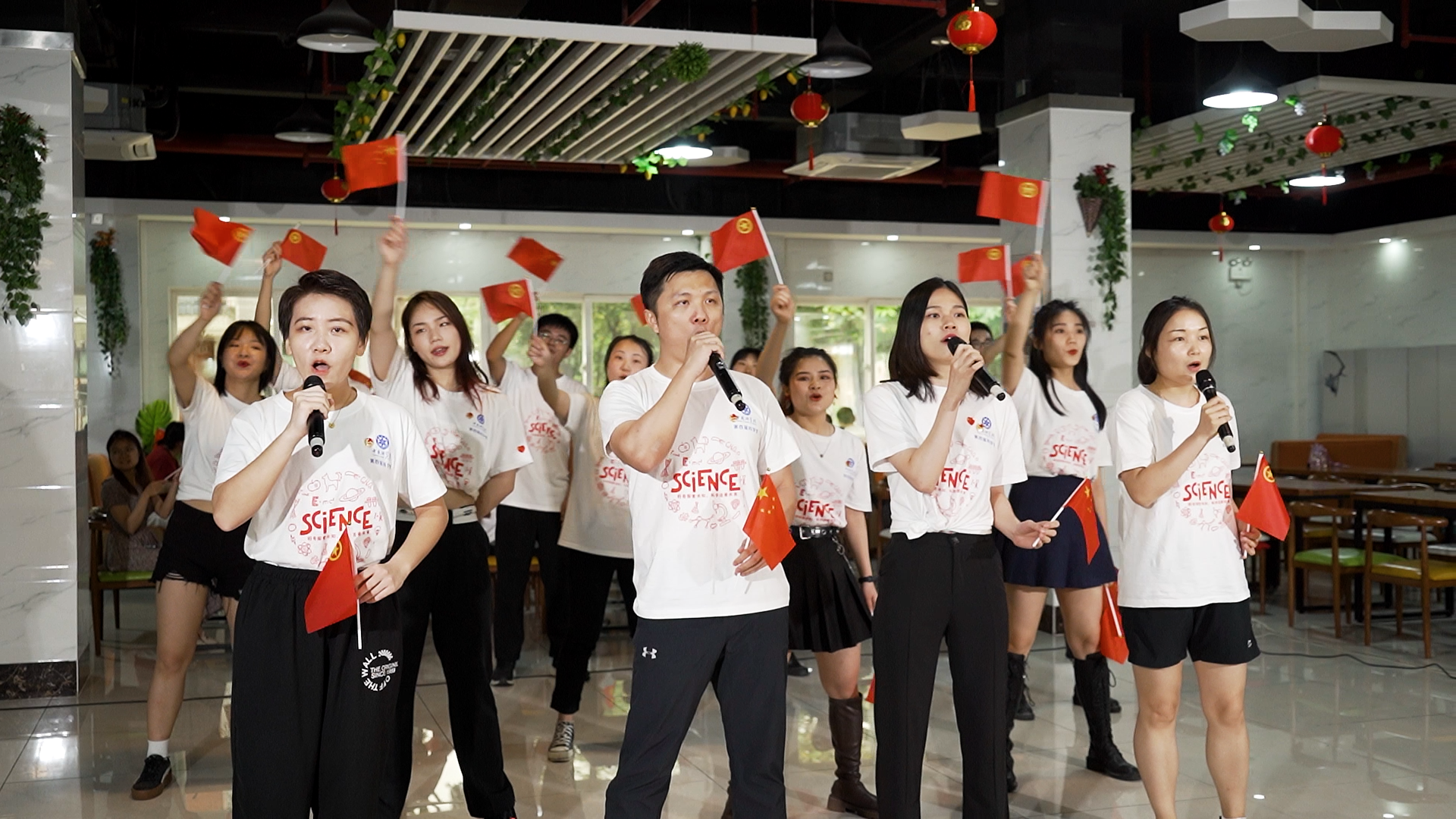 活動(dòng)伊始,健康院食堂用餐的師生們正熱烈討論今天的食堂是不是有事發(fā)生。11:30,一首五月天的《倔強(qiáng)》旋律忽然從食堂東側(cè)響起,一經(jīng)十幾秒,正當(dāng)大家尋找音樂來源時(shí),一名主唱從食堂西側(cè)人群中走出,《倔強(qiáng)》的歌聲開始冉冉升起,伴隨著四名主唱的匯聚,健康院食堂中洋溢著青春四射的悠揚(yáng)歌聲。主唱演員或面對(duì)周圍師生們,或互相對(duì)望,活力四射,鏗鏘有力的歌聲感染了現(xiàn)場(chǎng)師生們。用餐的師生們?cè)骄墼蕉啵麄兗娂娡O率种械牟途?,緊接著在一名女領(lǐng)舞的帶領(lǐng)下,舞蹈團(tuán)隊(duì)的同學(xué)們上演了活力四射的《我們都是追夢(mèng)人》和《奔跑的青春》的舞蹈串燒,現(xiàn)場(chǎng)人聲鼎沸,紛紛鼓掌,快閃活動(dòng)持續(xù)走向高潮,更多的師生被吸引進(jìn)來。最后,舞蹈表演完畢,舞蹈與唱歌的同學(xué)變換位置,《我和我的祖國》的歌聲悠然響起,形成新高潮,整個(gè)活動(dòng)愈發(fā)精彩,在一旁用餐的師生們們也揚(yáng)起了小紅旗和共青團(tuán)旗,隨著歌聲一起揮動(dòng)。