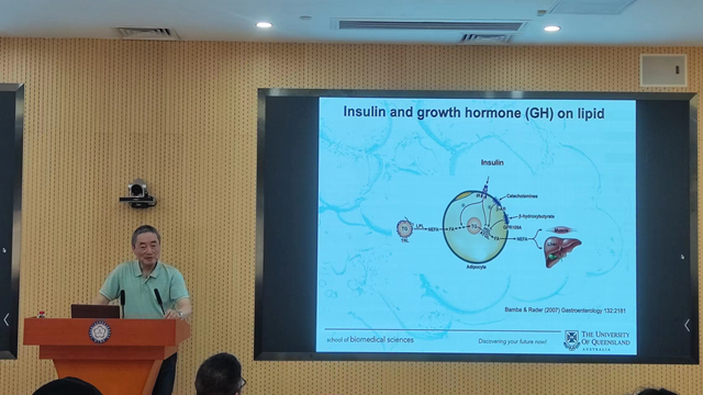 陳晨以“Academic Career in a Rapidly Changing World”為主題,結(jié)合他的教育經(jīng)歷、工作經(jīng)歷,講述其在代謝調(diào)節(jié)、生長激素、糖尿病、肥胖、內(nèi)分泌相關(guān)腫瘤等領(lǐng)域的研究和個(gè)人心得體會(huì)。此外,他還結(jié)合實(shí)驗(yàn)案例,為在座學(xué)生講解飲食與激素、代謝、肥胖之間的關(guān)聯(lián),不同年齡、不同性別的代謝和生長激素的差異等。