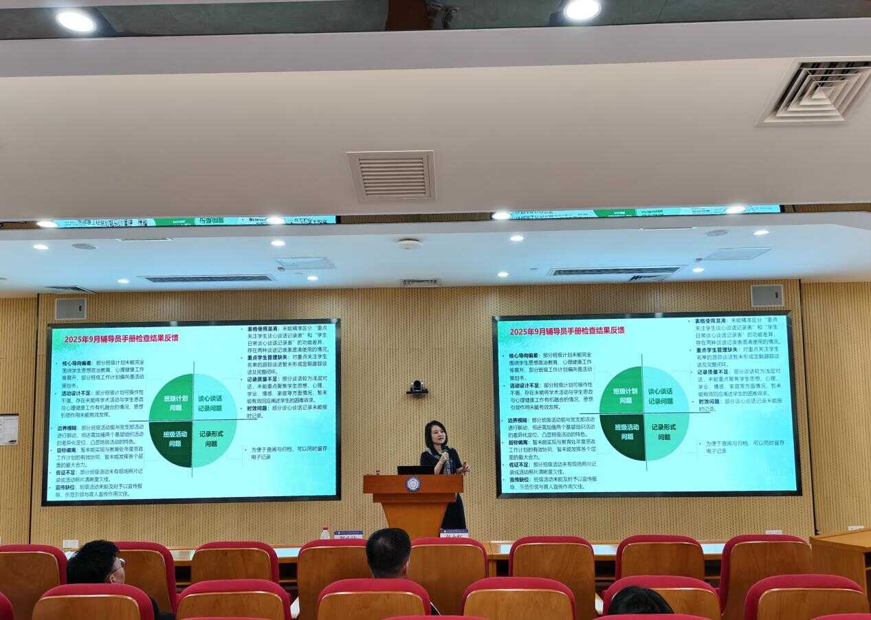 隨后,教育處負(fù)責(zé)人鄭小潔通報(bào)《輔導(dǎo)員工作手冊》核查情況,明確記錄規(guī)范并提出改進(jìn)建議,分享學(xué)生思政及心理健康教育工作實(shí)用方法與技巧,切實(shí)推動學(xué)生管理與心理健康工作向標(biāo)準(zhǔn)化、精細(xì)化邁進(jìn)。