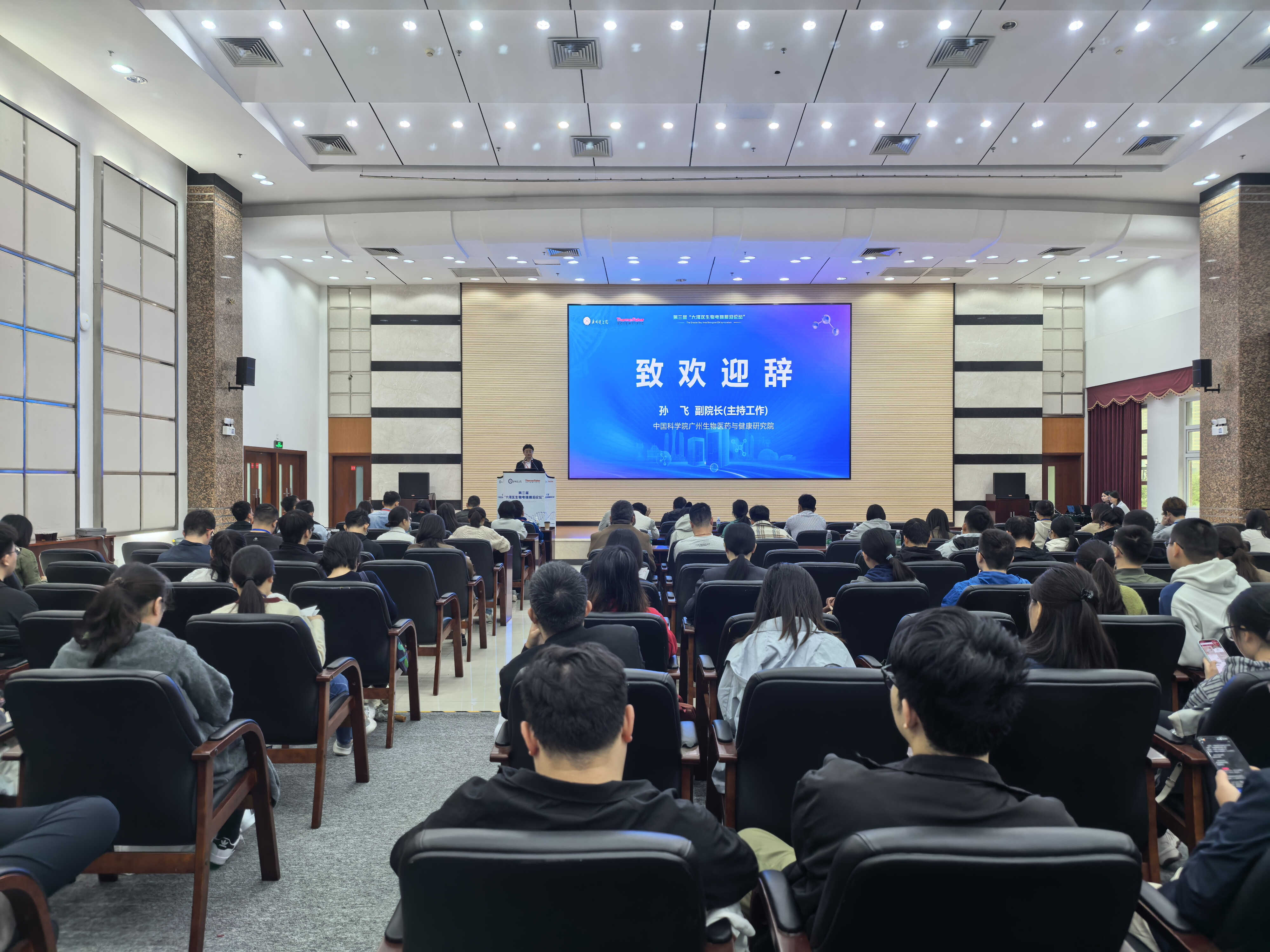 12月13日,由中國(guó)科學(xué)院廣州生物醫(yī)藥與健康研究院數(shù)字生物醫(yī)學(xué)研究中心主辦的第三屆“大灣區(qū)生物電鏡前沿論壇”在廣州健康院開幕。本屆論壇聚焦技術(shù)革新與科學(xué)問題深度融合,吸引了來自香港大學(xué)、香港科技大學(xué)、深圳醫(yī)學(xué)科學(xué)院、南方科技大學(xué)及中國(guó)科學(xué)院南海海洋研究所等粵港澳大灣區(qū)高校與科研機(jī)構(gòu)的百余位專家學(xué)者及青年研究人員參會(huì)。論壇榮譽(yù)主席、中國(guó)科學(xué)院廣州生物醫(yī)藥與健康研究院孫飛副院長(zhǎng)(主持工作)致歡迎辭,執(zhí)行主席何俊研究員主持開幕式。
