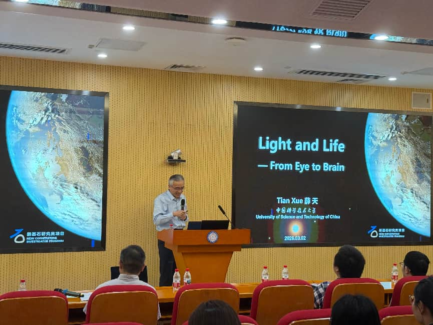 薛天教授是國(guó)際著名的視覺(jué)神經(jīng)生理學(xué)家,長(zhǎng)期致力于視覺(jué)神經(jīng)生理領(lǐng)域的基礎(chǔ)與轉(zhuǎn)化研究。報(bào)告中,薛天教授圍繞“光與生命”的主題,系統(tǒng)闡述了其團(tuán)隊(duì)在分子、細(xì)胞、環(huán)路和整體層次解析視覺(jué)神經(jīng)生理系統(tǒng)工作機(jī)制的系列研究。他指出,光作為生命之源,地球生命體經(jīng)過(guò)數(shù)十億年進(jìn)化形成了復(fù)雜的光感知系統(tǒng),兼具成像和非成像生理功能,而光損傷又會(huì)導(dǎo)致嚴(yán)重視覺(jué)疾病。薛天教授詳細(xì)介紹了團(tuán)隊(duì)在感光細(xì)胞功能、視網(wǎng)膜神經(jīng)環(huán)路、視覺(jué)信號(hào)傳遞以及光調(diào)節(jié)生理過(guò)程等方面的前沿探索,并分享了他們開發(fā)的面向眼科疾病的生物治療新技術(shù)。這些工作不僅深化了對(duì)視覺(jué)神經(jīng)機(jī)制的理解,更在國(guó)際上開拓和引領(lǐng)了“光調(diào)節(jié)生命過(guò)程”這一新興研究領(lǐng)域。