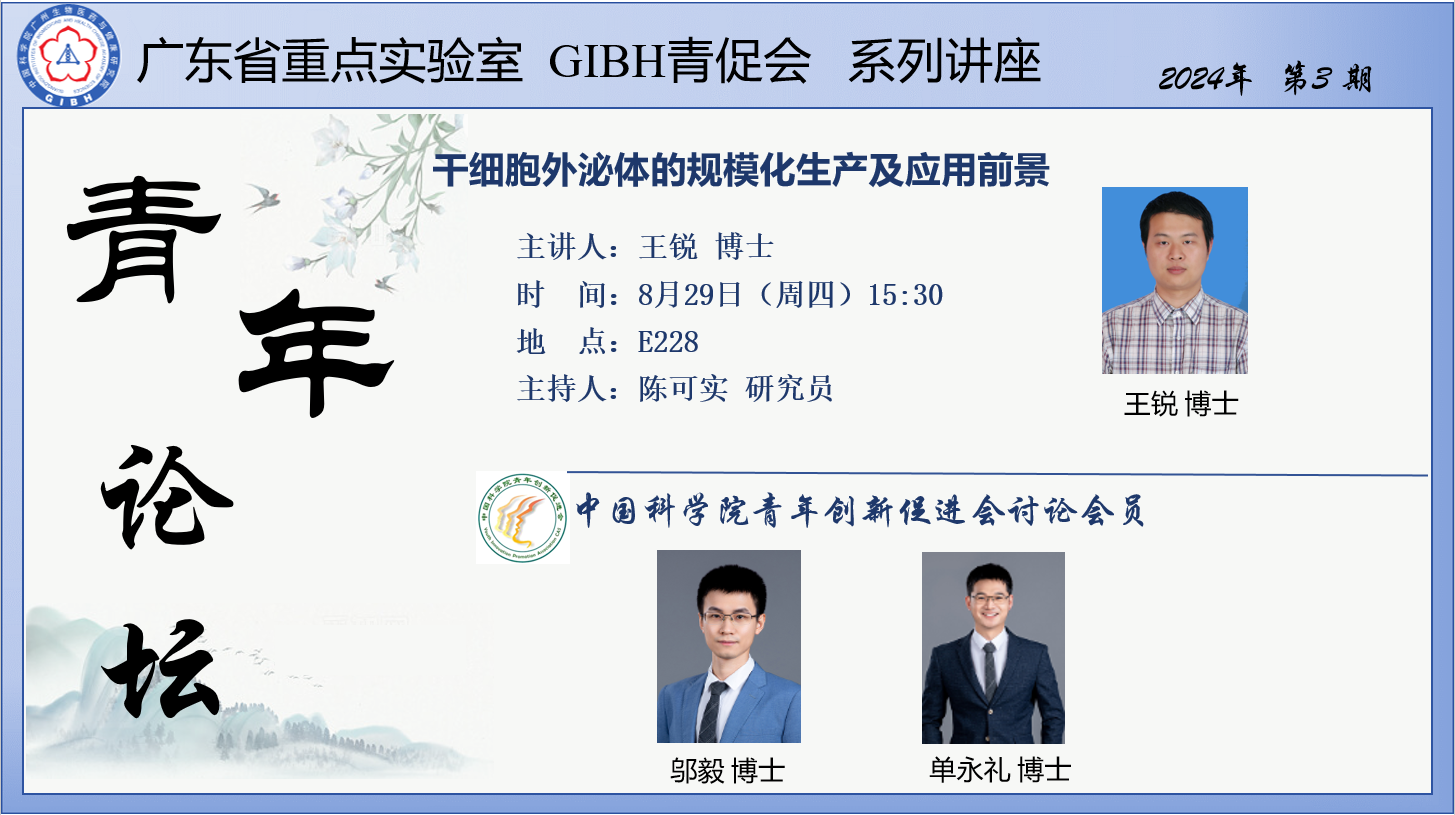 2024年8月29日廣東省重點(diǎn)實(shí)驗(yàn)室GIBH青促會系列講座(2024年第3期):干細(xì)胞外泌體的規(guī)模化生產(chǎn)及應(yīng)用前景