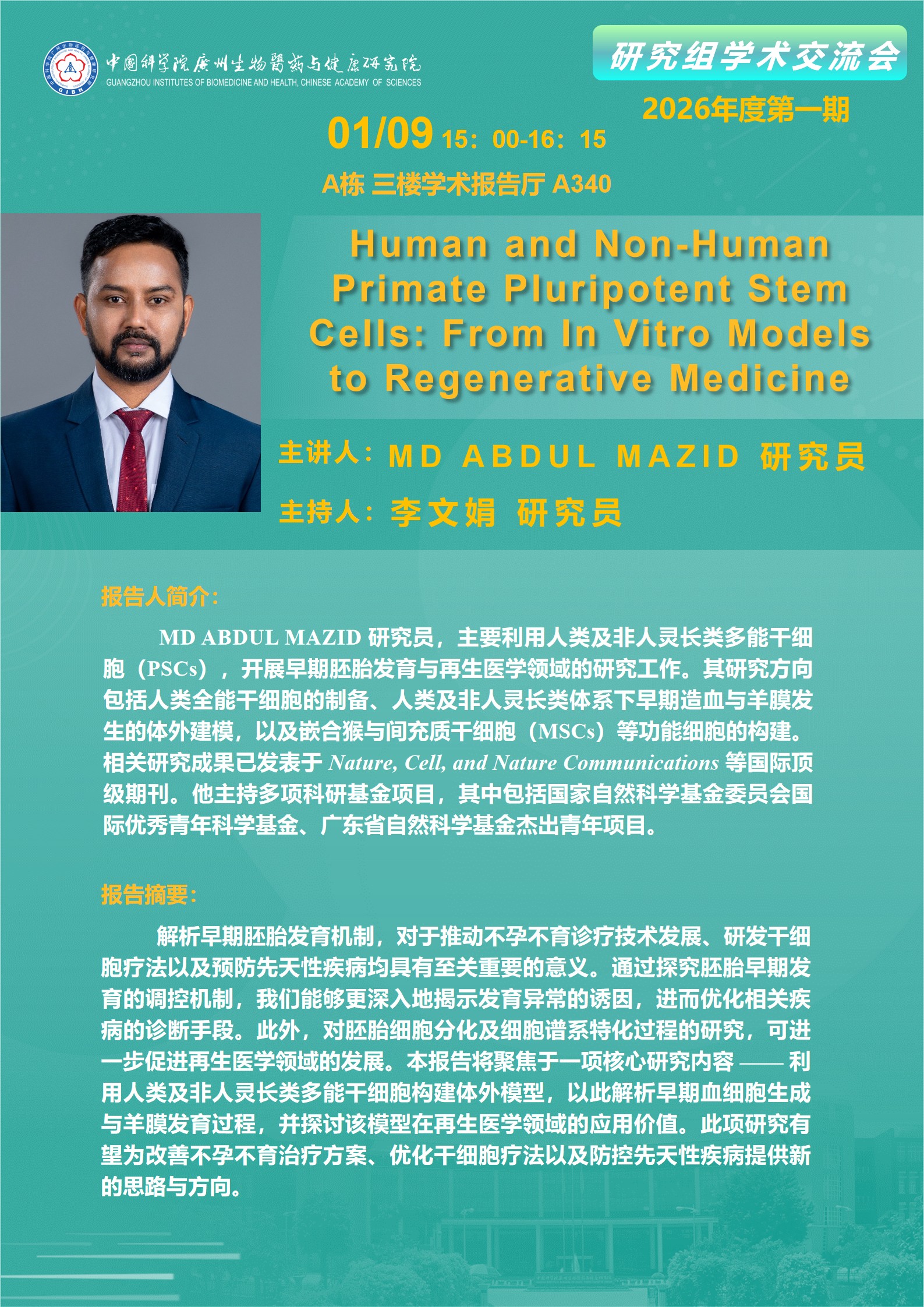 2026年1月9日研究組學(xué)術(shù)交流會(2026年度第一期):Human and Non-Human Primate Pluripotent Ste Cells: From In Vitro Models to Regenerative Medicine