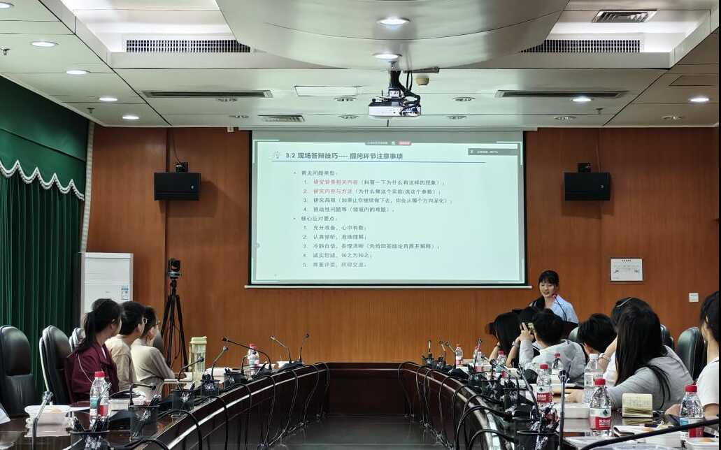 李菲以《制勝答辯,完美收官》為題,系統(tǒng)闡述了答辯PPT制作的關鍵要素與框架設計、匯報呈現(xiàn)及答辯提問應對技巧。她特別強調答辯匯報中自信表達的重要性,并歸納了常見的提問類型,以及聚焦細節(jié)的圖表解讀、數(shù)據(jù)分析等具體問題。